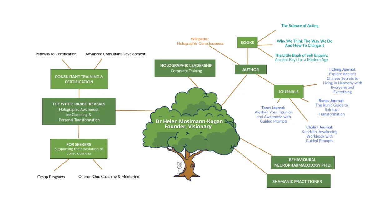 My work has grown and branched out over the years, much like a tree. This visual map illustrates how the different aspects of my background, my writing, and my programs all connect to a central vision of holographic awareness.